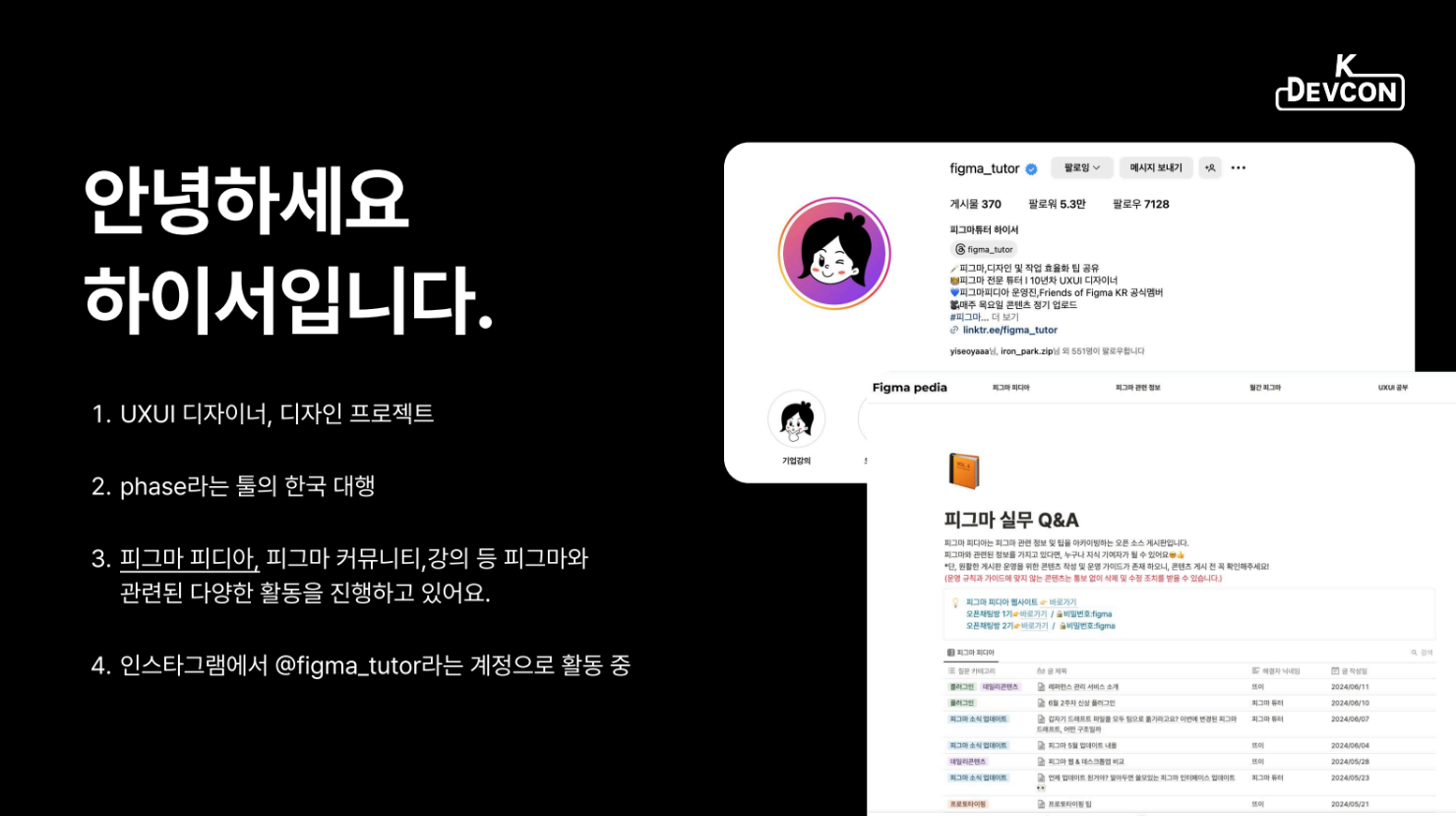 다섯번 째 세션은 하이서 님(피그마튜터) 께서 "의사소통 비용을 줄여주는 피그마 200%활용방법"이라는 주제로 피그마 활용법의 핵심을 짚어주셨어요. 특히 비디자인 직군의 경우에는 피그마를 어디까지 배워야할까 고민인 분들께는 꼭 협업할 때 알아두면 좋은 기능들을 소개해주셨어요.
