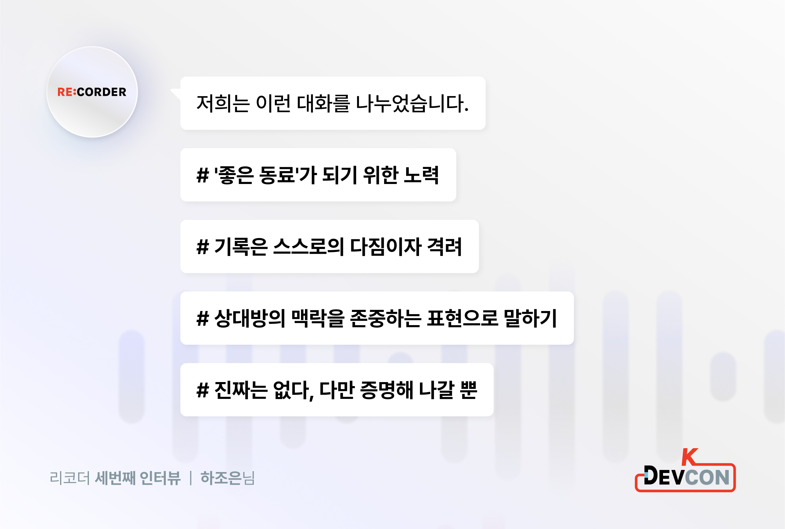조은님은 그런 리더들이 있었기에 스스로도 납득하며 일할 수 있었고, 팀 전체가 더 나이스하게 워킹할 수 있었다고 말합니다.