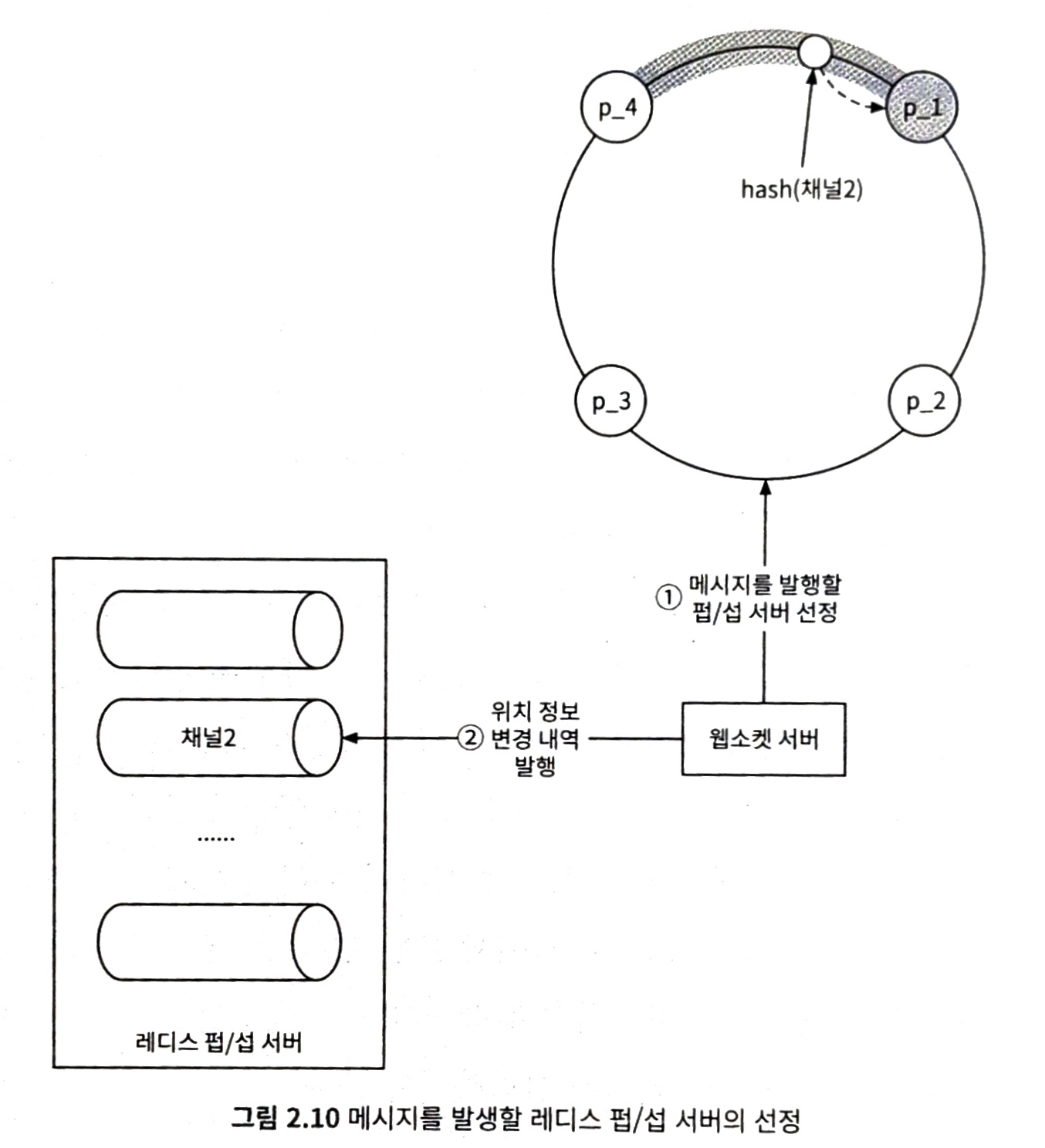 안정해시를 통해 어떤 Pub/Sub 서버를 사용할지 정한 후, 해당 서버의 특정 채널에 Publish(발행) 요청을 보냅니다. 그러면 해당 채널을 구독하고 있던 웹소켓 서버는 데이터를 수신하고, 웹소켓을 통해 실제 사용자에게 데이터를 전달하는 방식입니다.