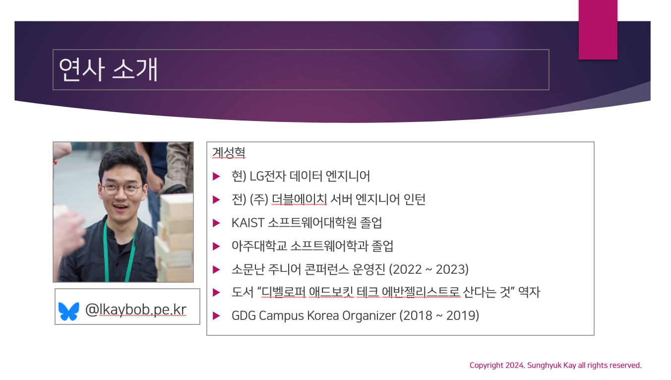 뭐니 뭐니 해도 데브콘의 핵심은 고퀄리티의 연사 섭외력입니다. 귀한 시간을 내고 오시는 분들이 많은 만큼 연사 섭외에 대해 무척 고민하고 심혈을 기울이는 데브콘은 이번 2024년 첫 밋업을 준비하며 새해다짐, 목표, 포부, 커리어 고민에 발맞춰 두 분의 연사님을 무대로 모셨습니다. 그중 오늘은 1탄으로 現 LG전자 데이터 엔지니어 계성혁님의 이야기를 담고자 합니다.