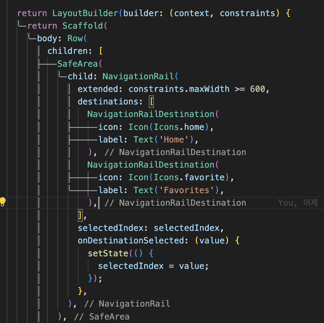 그리고 또 흥미로웠던 부분은 NavigationRail이다. 지금까지는 flutter로 ios와 android 앱만 개발하보니 웹에서 쓰이는 위젯은 처음 사용해봤다.