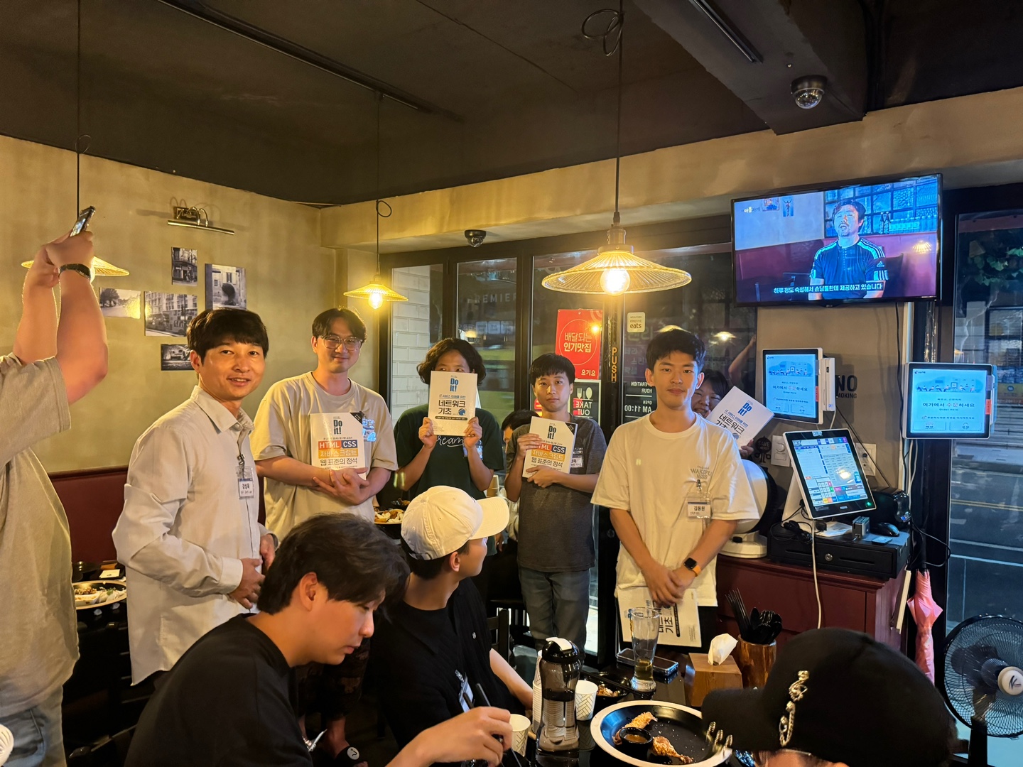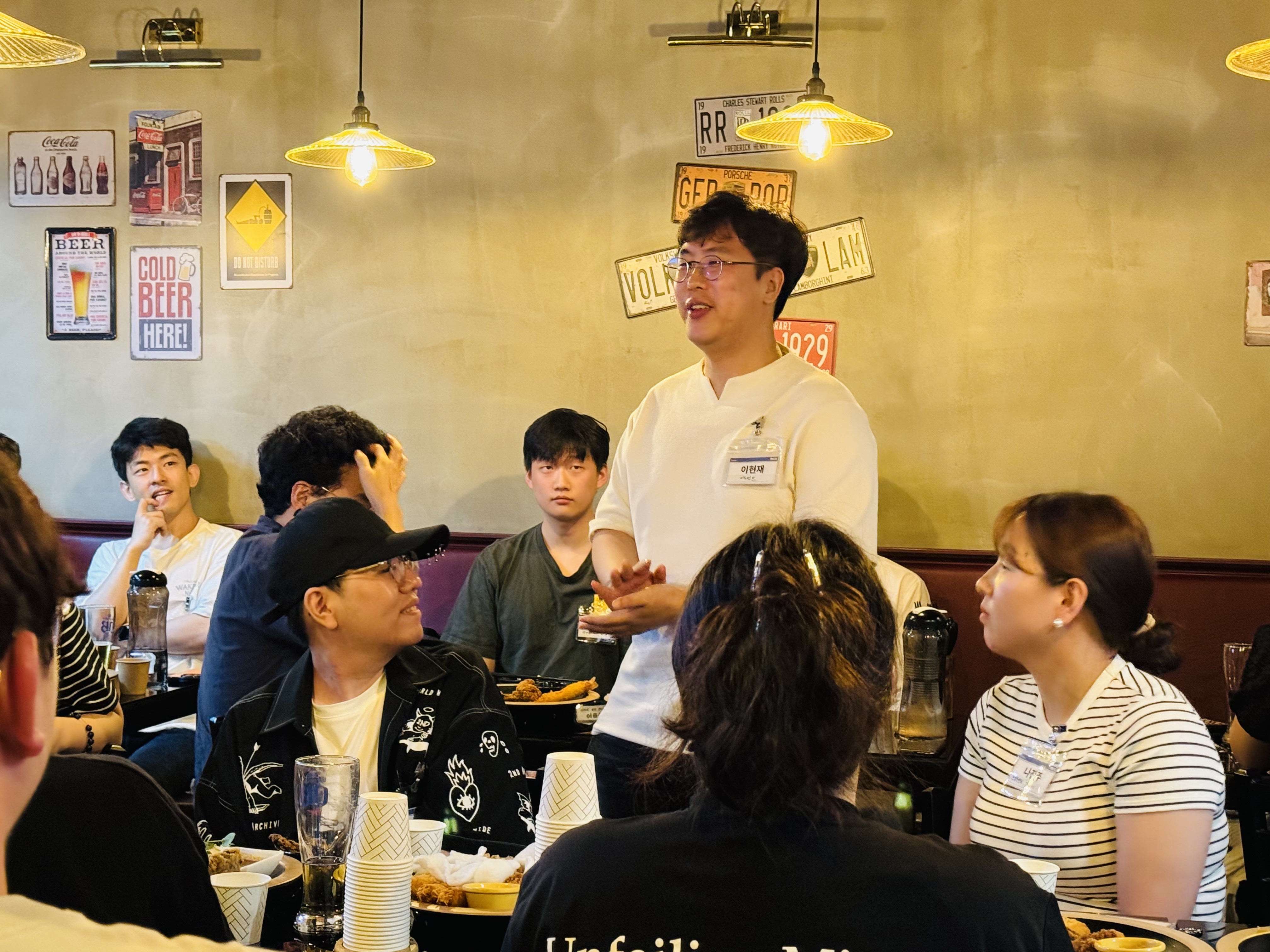 이번 치맥 행사에서는 일반 회원들 이외에 운영진들의 지인을 초대하는 자리였습니다. Megazone Cloud - SA의 김현민 님, 안랩클라우드메이트 Service Dev Team Leader 김정우 님이 자리해 주셨으며, 메가존과 안랩카라우드메이트의 반짝이는 인재 채용 소식도 들을 수 있었습니다.
