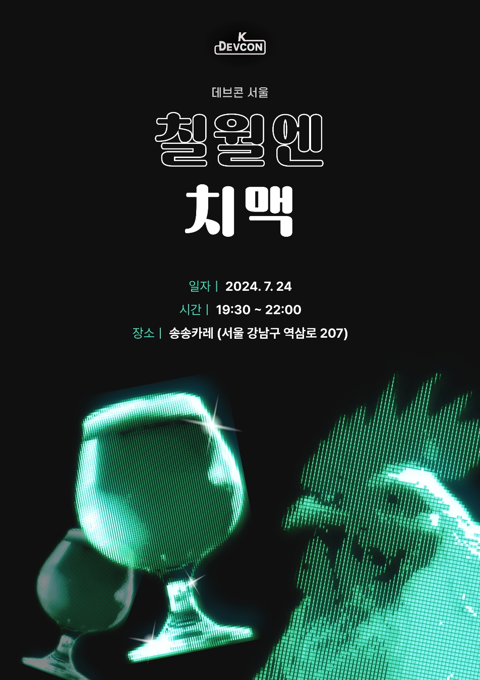 7월에도 휴가는 커녕 사무실에서 바캉스(?)를 하는 데브콘 회원들을 보고 간단히 퇴근 후 강남에서 치맥을 하면 어떨까 의견이 나와 급하게 기획했습니다. 장소 섭외부터 포스터 제작, 사전 리허설 및 당일 셋팅을 위한 명함 제작까지 우리 운영진은 즐겁게 이 행사를 준비했습니다. 기획할 시간이 많지는 않아 살짝 걱정을 했지만 선착순 마감이었음에도 티켓이 빠르게 소진되었습니다. 정말 놀라웠습니다~!!