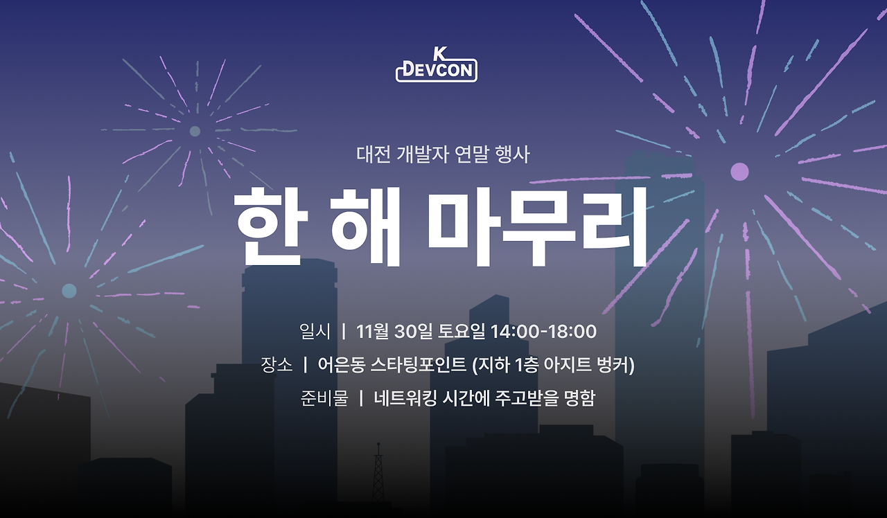 지난 11월 30일(토) K-DEVCON 대전 챕터에서는 <데브콘 대전 : 대전 개발자 한 해 마무리> 이라는 테마로 모였습니다.